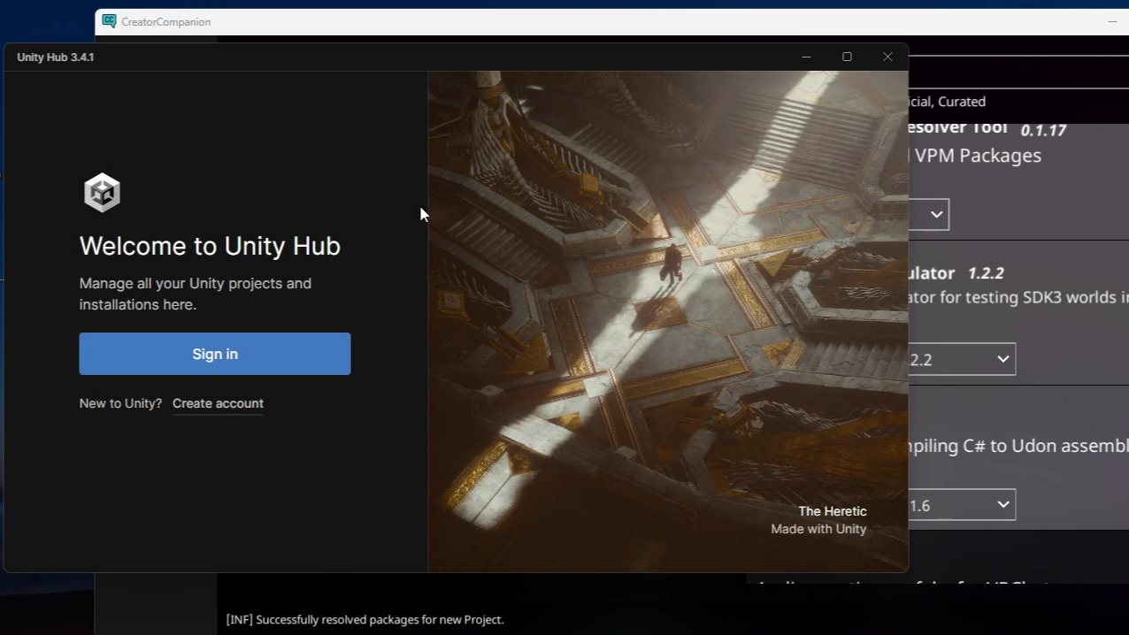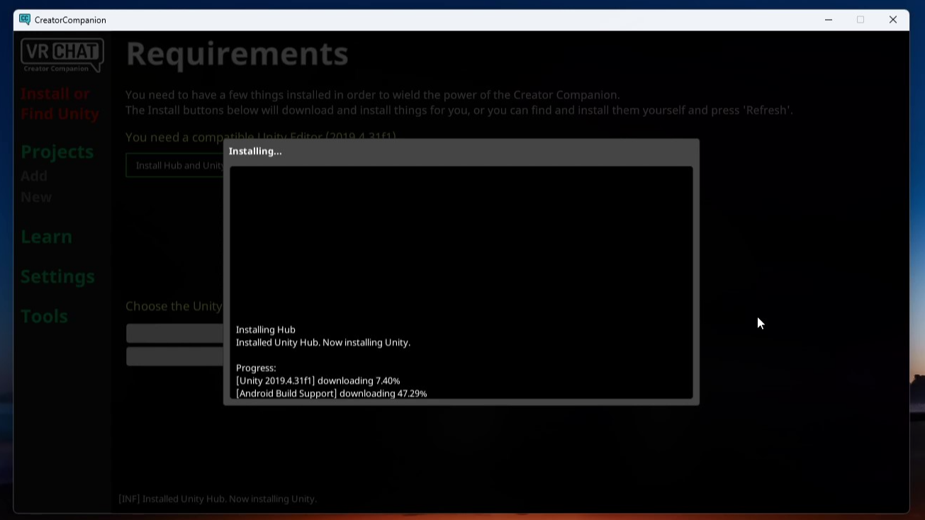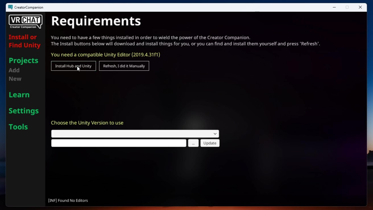유니티 허브와 최신 버전의 유니티가 없다면 VCC에서 설치를 안내해 줍니다.