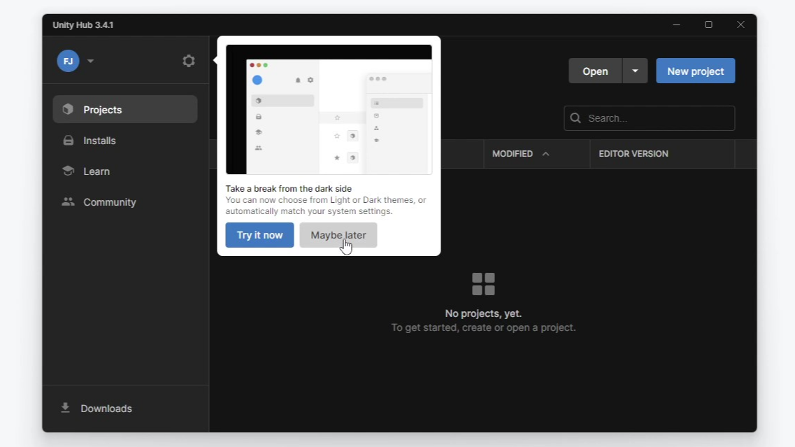 처음 Open Project를 누르면 유니티 허브가 실행됩니다.