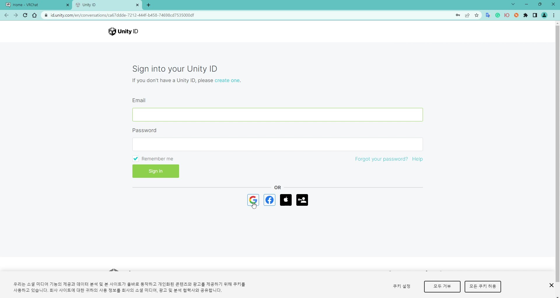 로그인 화면이 나오면 생성한 계정으로 유니티 로그인을 합니다.