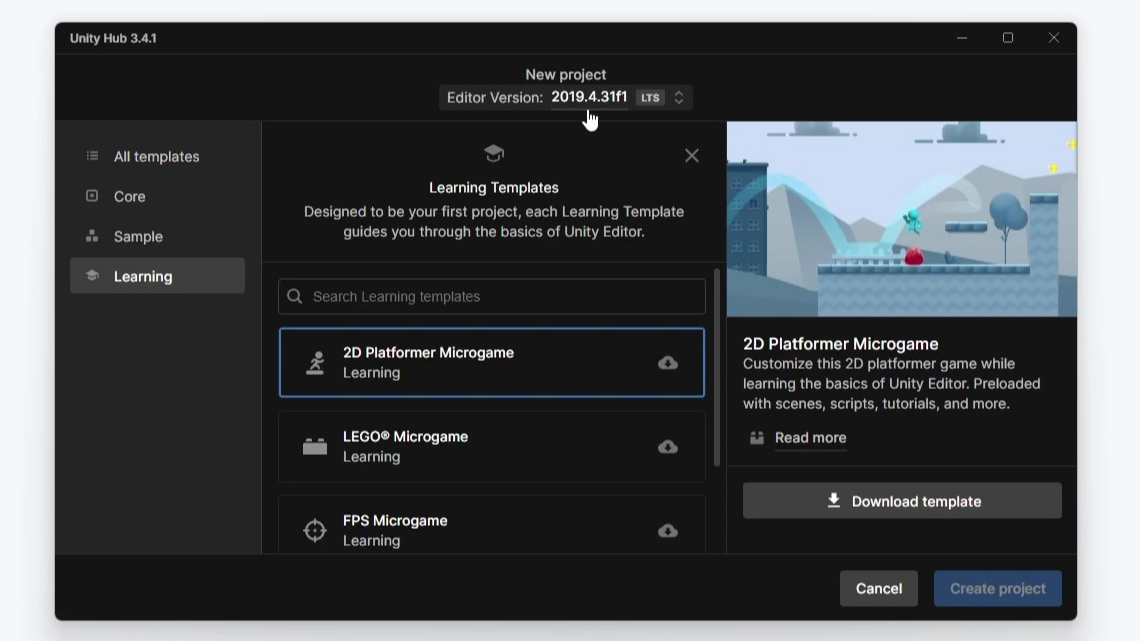 화면의 New project 버튼을 눌러보시면 Editor Version 2019.4.31f1 로 표시된 것을 확인할 수 있습니다.