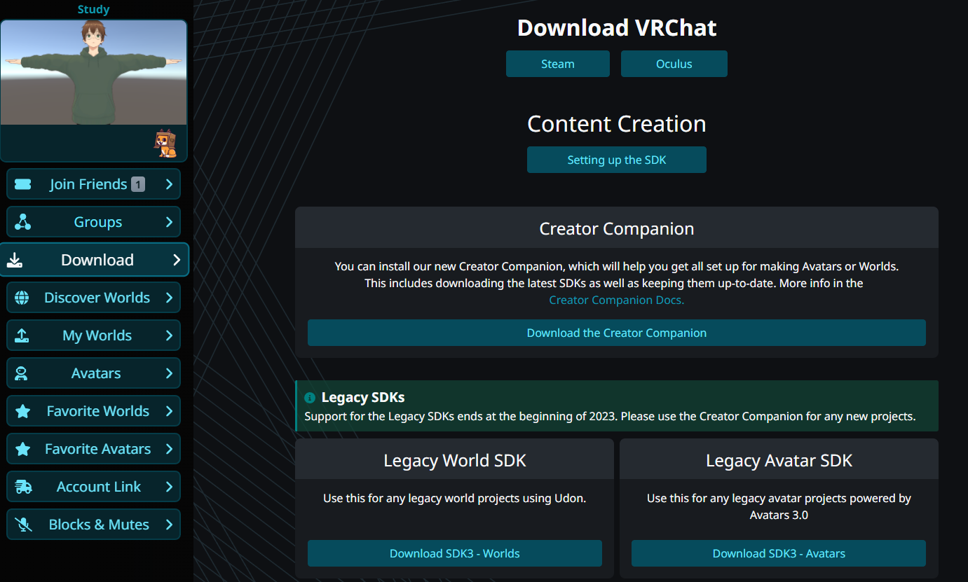 https://vrchat.com/home/download 에 로그인하셔서 VCC를 다운로드하실 수 있습니다.