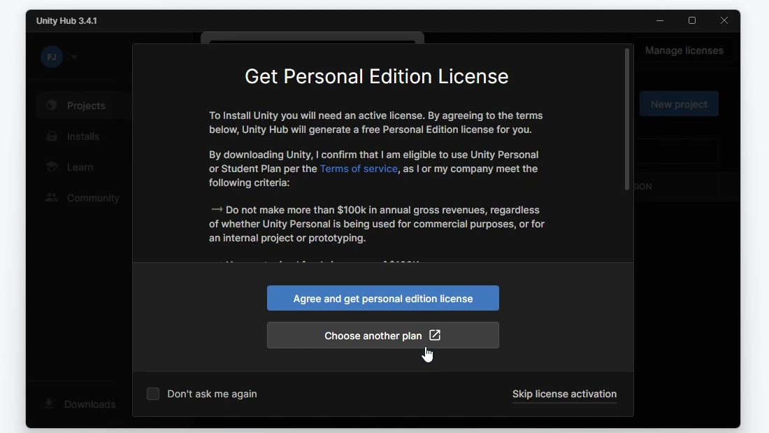 관련 안내 사항을 읽고 동의하신다면 Agree and get personal edition license 버튼을 클릭합니다.